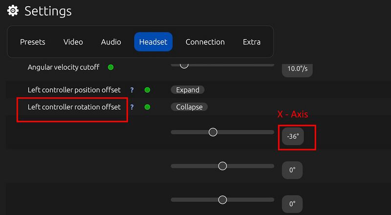 - Left Controller Rotation Offset (X-Axis): -36° → korrigiert die Controller-Ausrichtung, damit sie natürlicher in der Hand liegen.