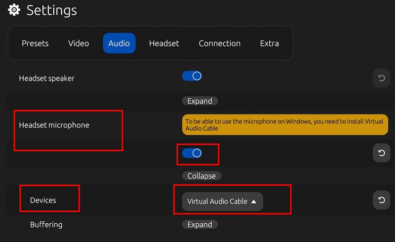 - Headset Microphone: über Virtual Audio Cable (für Voicechat nötig).