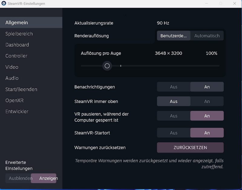 - Renderauflösung pro Auge: 3648 × 3200 (100 %) → reicht völlig aus, da ALVR ohnehin 3660 × 3200 streamt.